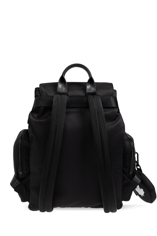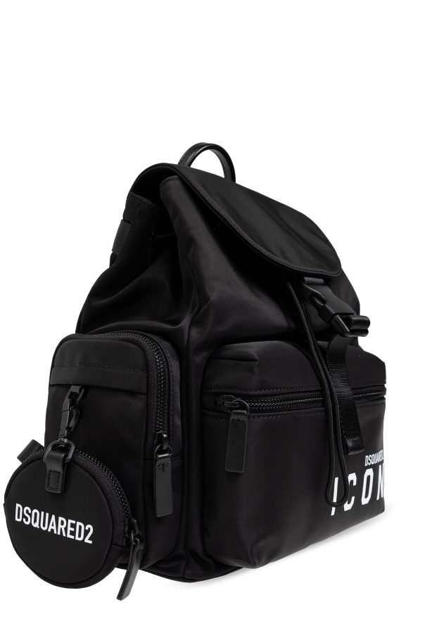 Introducing the Dsquared2 ICON Backpack, an epitome of modern elegance and practicality, crafted for women who appreciate a blend of sophistication and functionality. This black backpack from the exclusive ICON series of Dsquared2 boasts a classic rectangular shape with rounded edges, exuding a timeless appeal. Constructed from a smooth, matte synthetic material, this backpack is designed to withstand various weather conditions, ensuring durability and longevity. The front features a large zippered pocket adorned with the prominent white \"Dsquared2\" logo and the bold \"ICON\" inscription, adding a statement touch to its minimalist design. The main compartment is secured with a drawstring closure and a flap with an additional buckle fastener, offering enhanced security for your belongings. The top handle and adjustable shoulder straps provide versatile carrying options and unparalleled comfort. Side pockets, also zippered, and a unique round pouch with the \"Dsquared2\" logo enhance the backpack\'s functionality and aesthetic charm. The spacious interior includes an extra zippered pocket, perfect for organizing your essentials. Why Choose This Product? Exclusive Design: From the renowned Dsquared2 ICON series, combining sleek style with practicality. Durable Material: Smooth, matte synthetic fabric for weather resistance and longevity. Functional Compartments: Multiple zippered pockets and a roomy interior to keep your items organized. Comfortable to Carry: Top handle and adjustable shoulder straps for versatile carrying options. Distinctive Details: Prominent logo and \"ICON\" inscription for a bold, stylish statement.