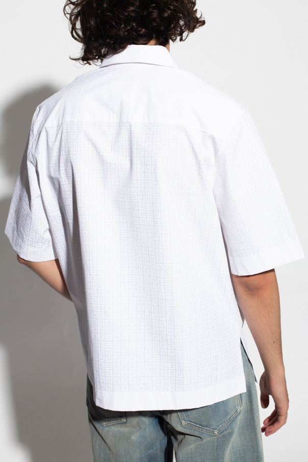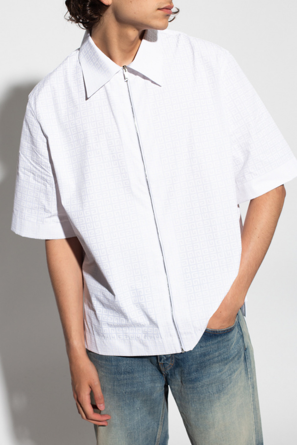 White shirt from Givenchy. Boasting a monogram pattern, this cotton-crafted style features short sleeves and a silver-tone zip fastening on the front.