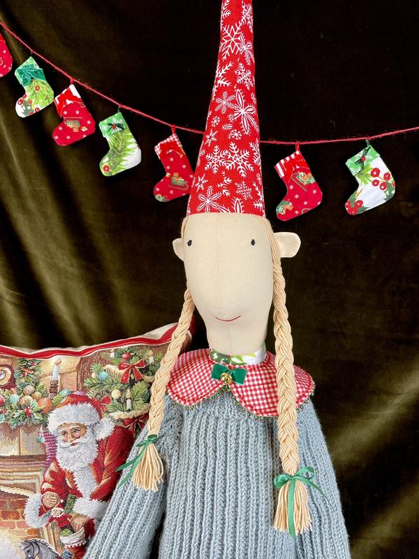 Кукла девочка гном сделана вручную и с любовью. Растом 130 см, поэтому это будет красивая кукла-подружка для ребенка или декор вашего дома к новогодним праздникам. Выполнена из дорогих тканей. Игрушка наполнена холлофайбером, мягкая. Гном может сидеть. Вся одежда гномика (юбочка, кофточка и воротничок) съёмная. Юбка на резиночке и на две стороны различные ткани, поэтому одна юбочка способна создать 2 образа)