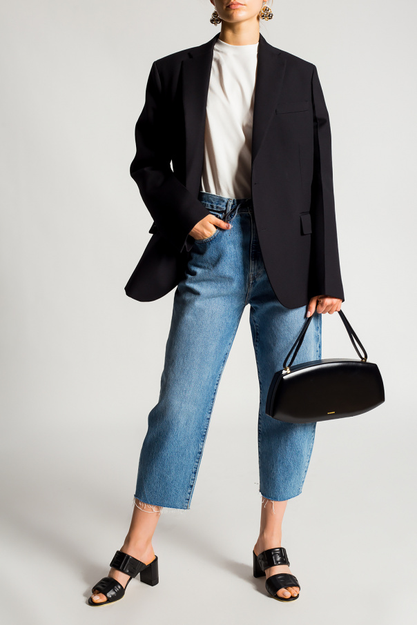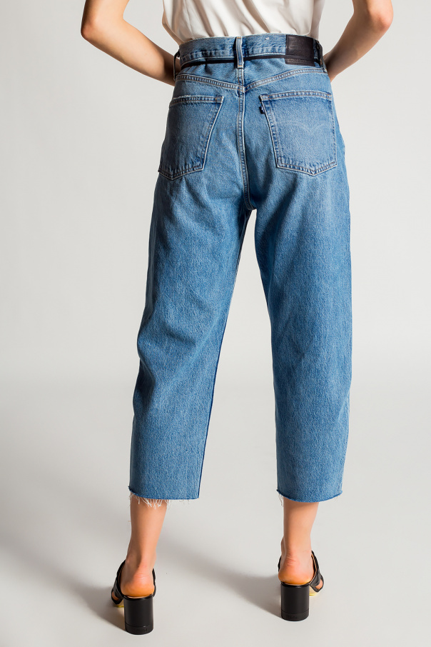 Blue ‘Barrel’ jeans from Levi’s, the ‘Made & Crafted ®’ collection. Fastened with zip fly and button, this pair falls down with cropped straight legs and features yellow stitching details, a tie fastening, black logo patch, raw cut edges, three front pockets and two back pockets.
