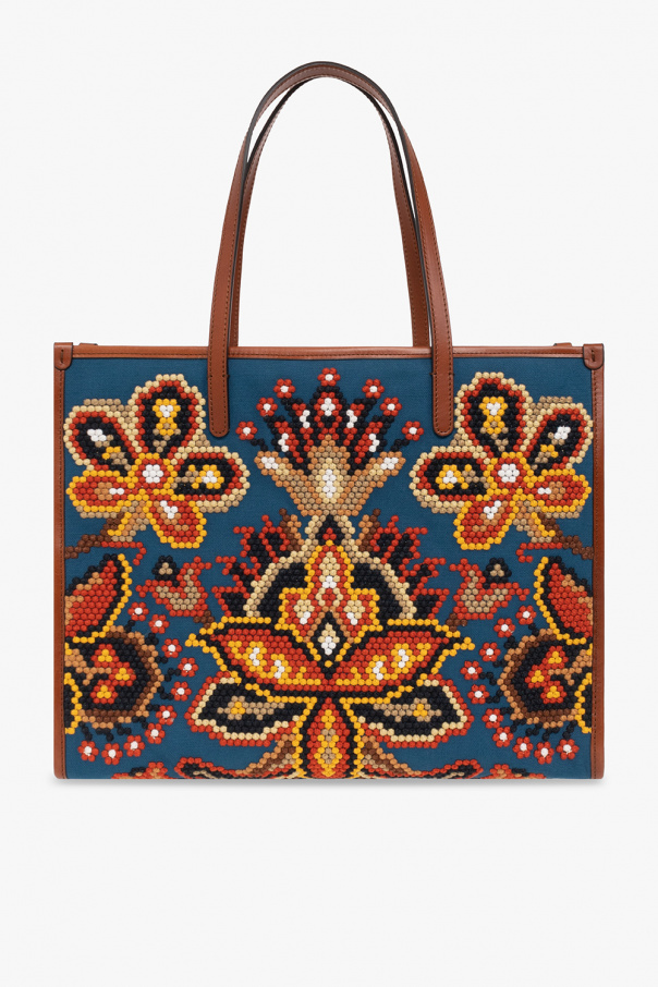 Dark blue shopper bag from Etro. Made of fabric with the brand’s signature jacquard paisley motif and calf leather trims, this model is complete with an embroidered multicolored floral motif, leather logo-embossed patch, two half-round handles, gold-tone metal hardware and one internal compartment with one zip pocket.