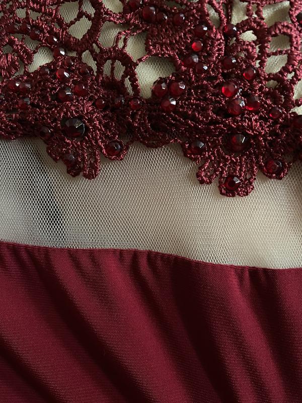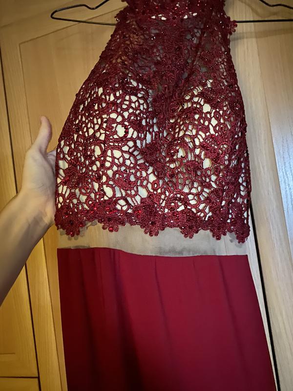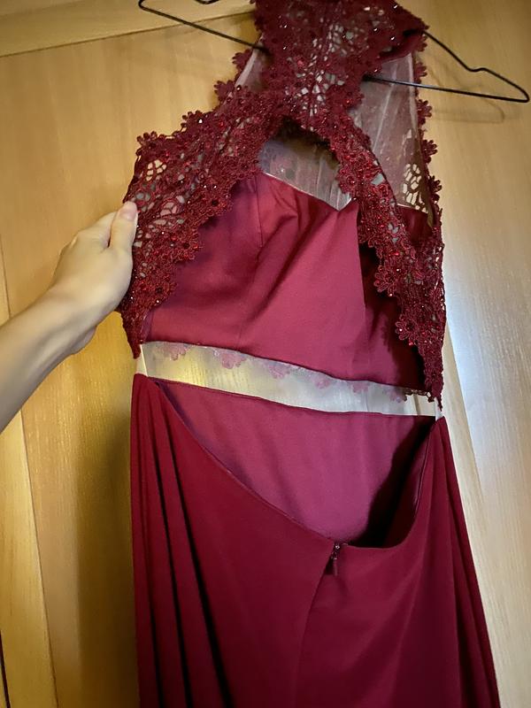 Вишневое вечернее платье сочетает в себе утонченность и современный стиль. Его верх украшен деликатным кружевом, прикрывающим шею, лопатки и ключицы, открывая глубокий вырез на спине до самой талии. Две изящные молнии сзади добавляют оригинальности и акцентируют внимание на элегантной спинке. Под грудью на уровне талии проходит тонкая полупрозрачная полоска, которая добавляет легкости и структуры силуэта. Облегающая юбка, плавно струящаяся в пол, подчеркивает фигуру, делая образ изысканным и привлекательным для любого торжественного события.