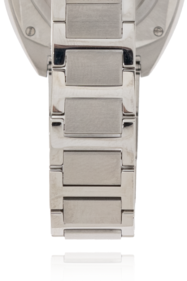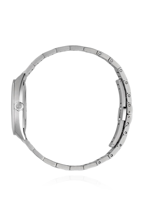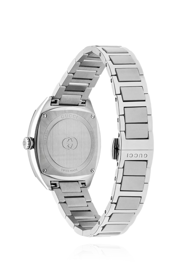 Introducing the quintessence of sophistication and timeless design, the \"Logo Watch\" by Gucci. Crafted with meticulous attention to detail, this exquisite timepiece showcases a lustrous silver stainless steel bracelet that elegantly wraps around the wrist, creating a seamless blend of luxury and comfort. The watch is powered by a precise quartz movement, ensuring accurate timekeeping. The round, elegant dial is adorned with striking gold hour markers, with select markers replaced by stones that mimic the brilliance of diamonds, adding a touch of opulence. The hands are finished in a delicate rose gold hue, offering a subtle contrast that enhances the watch\'s allure. At the 3 o\'clock position, the designer\'s logo proudly signifies the authenticity and esteemed craftsmanship behind this accessory. Its flat, rectangular metal links form a harmonious chain, culminating in a sophisticated butterfly clasp that secures the watch with grace. The crown on the right side allows for easy time adjustment, while the engraved logo on the back underlines the genuine quality and heritage of the Gucci brand. With a case diameter of 29 mm, the dial is framed with diamonds, presenting an exquisite view that captivates at first glance. Designed to complement both masculine and feminine styles, this versatile watch is a testament to Gucci\'s commitment to elegance and design excellence. Whether paired with a casual ensemble or formal attire, it stands as a symbol of refined taste. Why Purchase This Product? Timeless Elegance: A design that transcends trends, offering a timeless accessory. Premium Materials: Constructed with 100% stainless steel, ensuring durability and a luxurious finish. Exquisite Details: Features gold hour markers with diamond-like stones and rose gold hands for a sophisticated contrast. Versatile Design: A unisex piece that enhances both men\'s and women\'s wardrobes with its elegant design. Authenticity Guaranteed: Engraved designer logo as a mark of authenticity and superior craftsmanship.