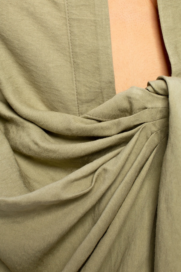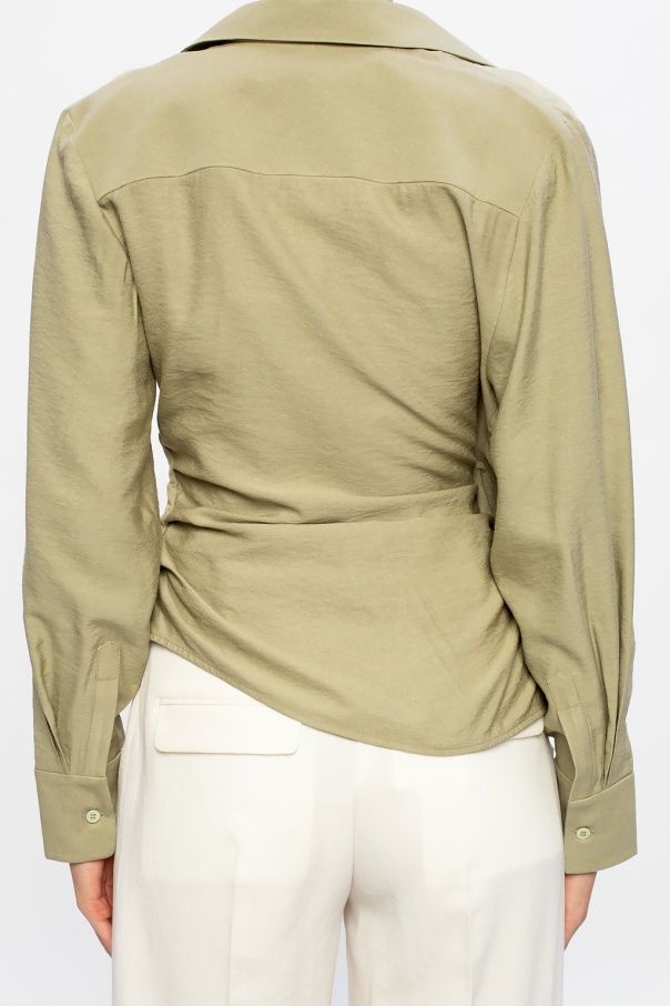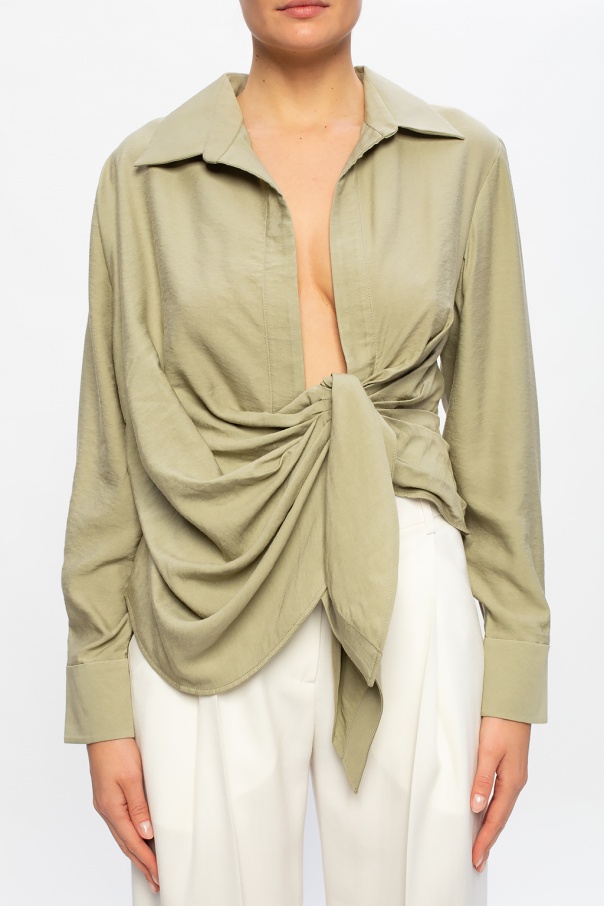 Green ‘Bahia’ shirt from Jacquemus. Featuring a distinctively draped knotted detail, this style is complete with buttoned cuffs.