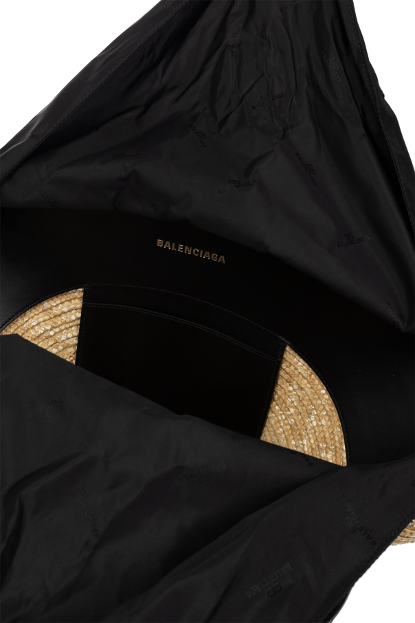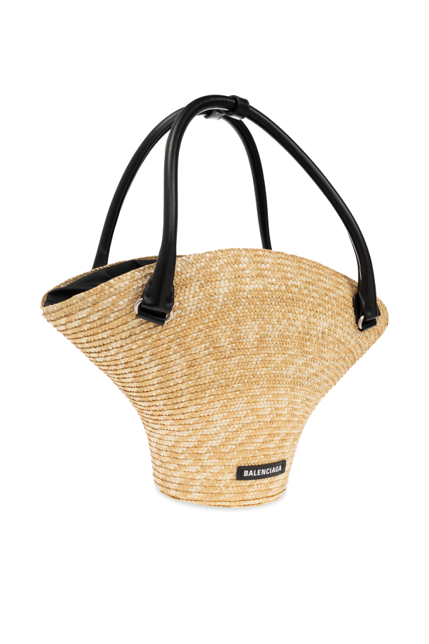 Beige shopper bag from Balenciaga. Crafted from woven straw and trimmed with black calf leather, this design cinches closed with drawstrings and showcases a white logo patch on the front. It is complete with two half-round handles with a snap connector, silver-tone metal hardware and one internal compartment with a slip pocket.