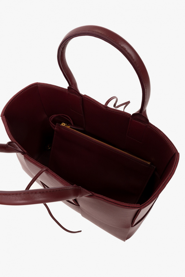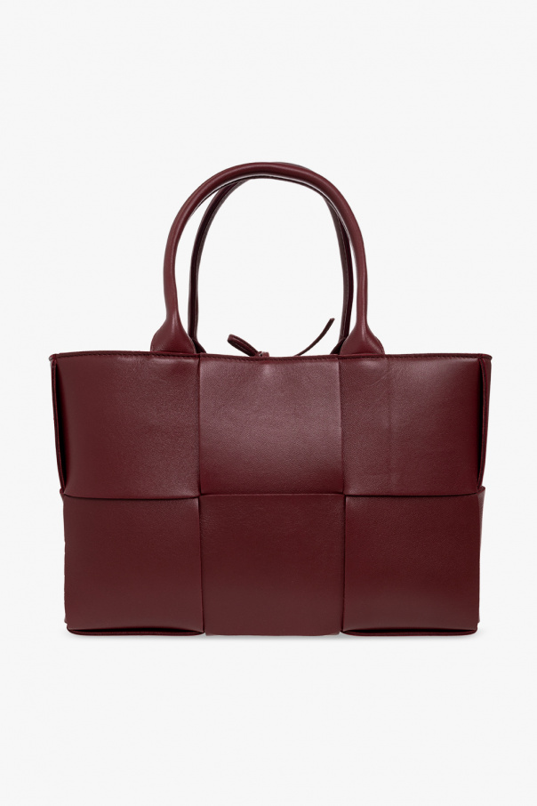 Brown ‘Arco Small’ shopper bag from Bottega Veneta. Made from lamb leather with the brand\'s iconic Intreccio weave, this design cinches closed with drawstrings and features an embossed logo on the side, two half-round handles, gold-tone metal hardware and one internal compartment with a removable zip pouch.