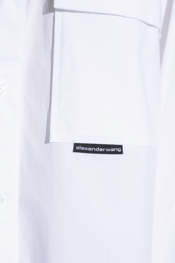 White oversize shirt from T by Alexander Wang. Made of cotton, this design is complete with button fastenings, black logo patch, two snap-fastened flap pockets and long sleeves with buttoned cuffs.