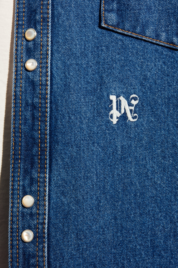 Dark blue denim shirt from Palm Angels. Made from cotton, this style showcases snap fastenings, white logo embroidery, two flapped pockets and long sleeves.
