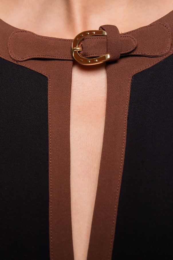 Black dress from Gucci. Fastened with a zip, a hook and a belt. Trimmed with brown fabric. Decorated with cut-out details. Drawstring waist. Round neck. 3/4 sleeves.