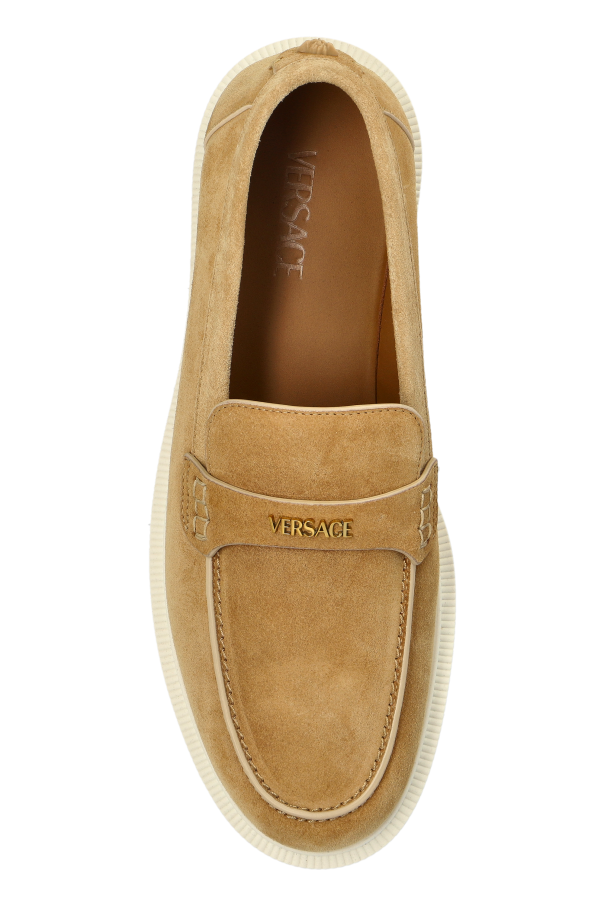Experience the epitome of style and comfort with the exquisite Suede Loafers by Versace. Crafted from luxurious beige suede, these loafers embody elegance and sophistication, seamlessly blending classic design with contemporary elements. The loafers feature a classic slip-on silhouette, effortlessly embracing the foot without the need for laces. A contrasting white rubber sole not only enhances the modern aesthetic but also ensures unparalleled comfort during wear. Adorning the front is a metallic designer logo, a testament to the exclusivity and prestige synonymous with the Versace brand. Meticulously finished with precision stitching, these loafers reflect the hallmark of high-quality craftsmanship. Why Choose This Product? Luxurious suede material in a versatile beige hue. Classic and convenient slip-on design. Comfortable and stylish contrasting rubber sole. Exclusive metallic Versace logo detail. Exquisite craftsmanship with meticulous stitching.