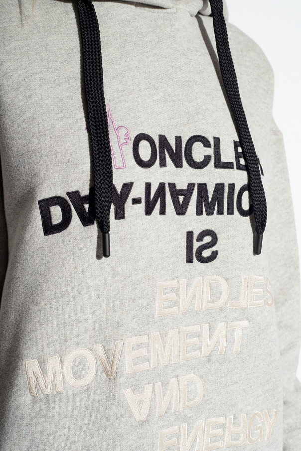 Grey, cream and purple sweatshirt with a drawstring hood from Moncler Grenoble. Crafted in contrasting fabric panels, this style features a relaxed fit, logo embroidery, two snap-fastened pockets on the front and elasticized trims on the bottom hem and cuffs.