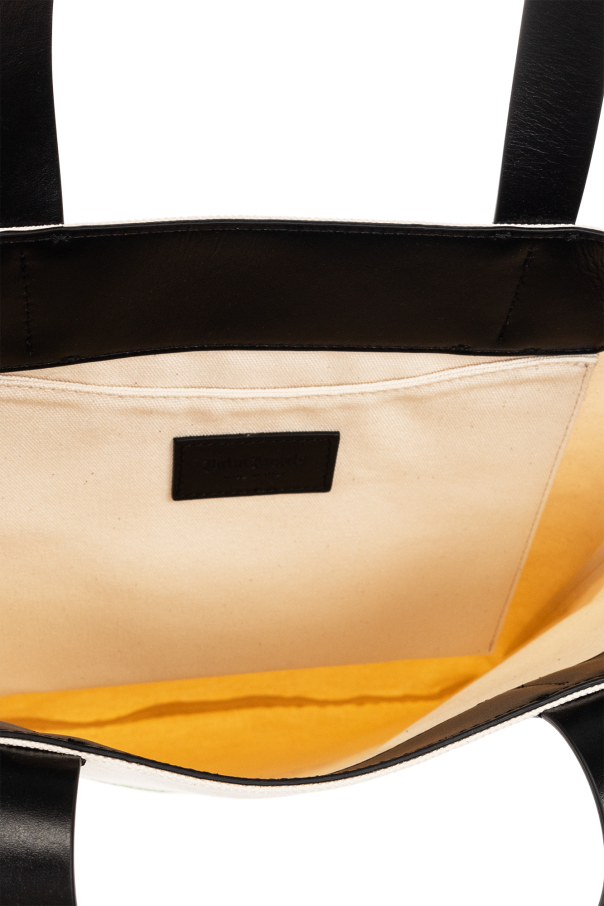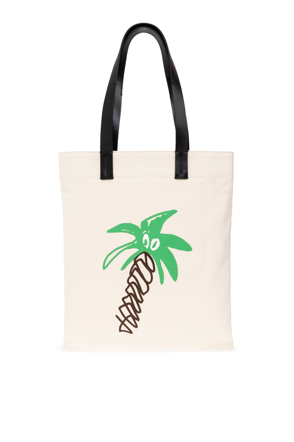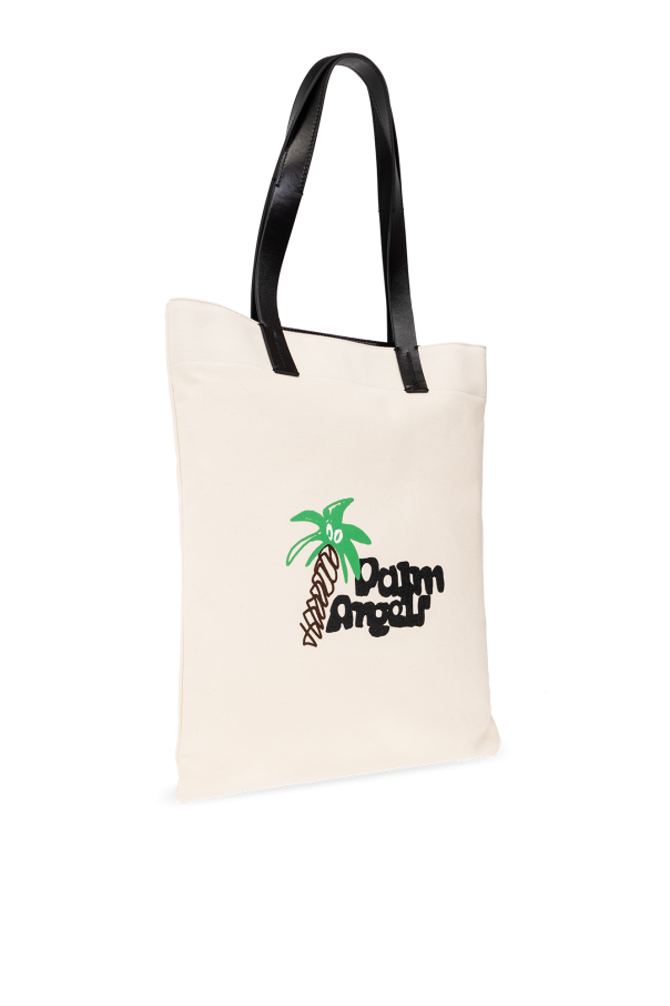 Cream shopper bag from Palm Angels. Crafted from cotton canvas and trimmed with black calf leather, this design showcases a printed black logo and green and brown palm tree on the front and back, two handles and one internal compartment with a slip pocket.