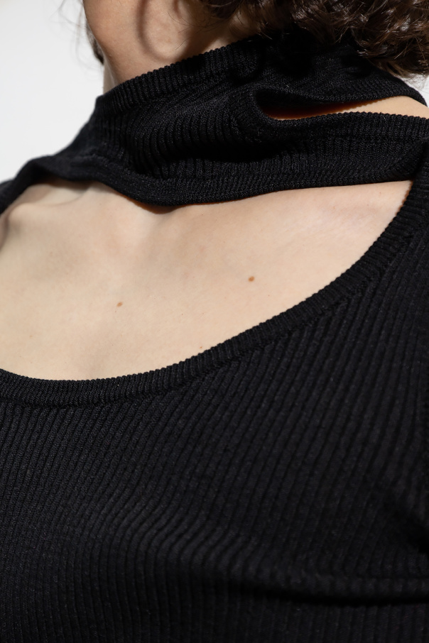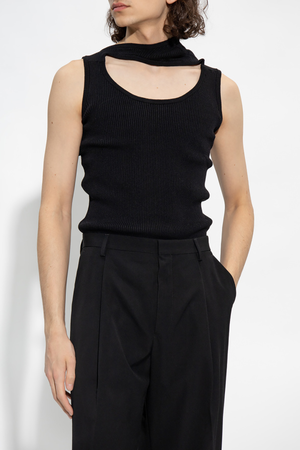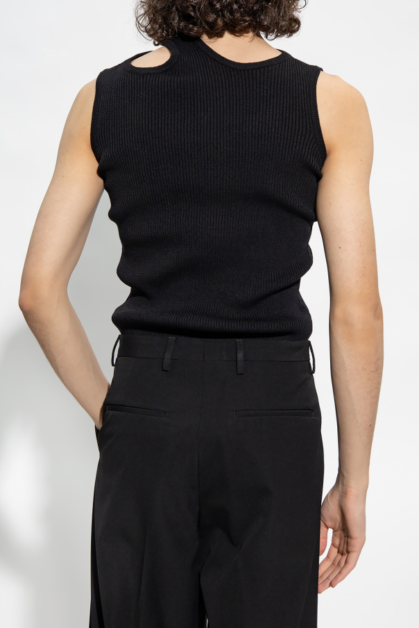 Black ribbed sleeveless T-shirt from Y Project, the ‘Evergreen’ collection. Made from sustainable materials, this garment has an asymmetric neckline with cut-outs.