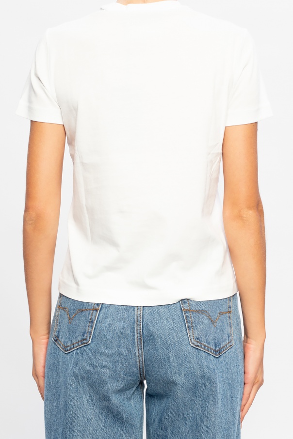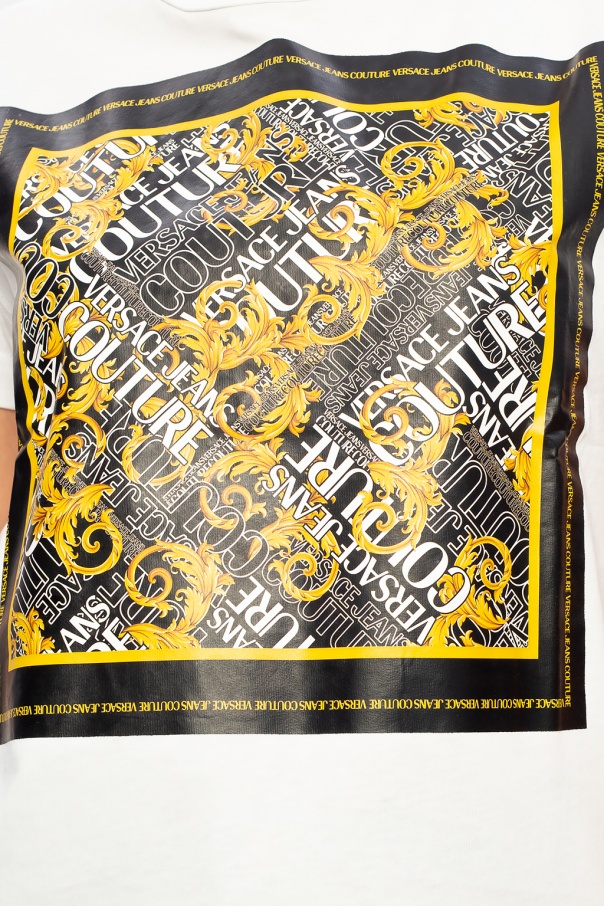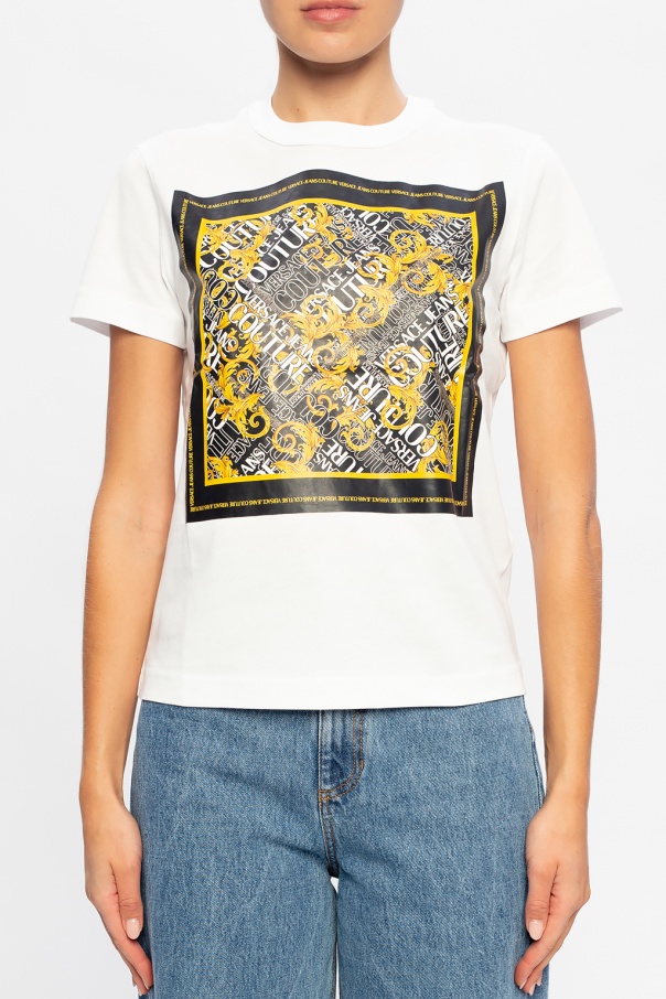 White crewneck T-shirt from Versace Jeans Couture. Crafted from cotton, this style has an elasticated collar and a yellow, black and white graphic print with the label\'s logo.