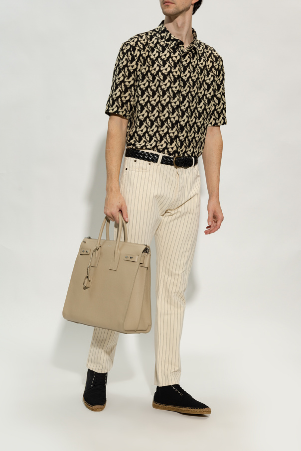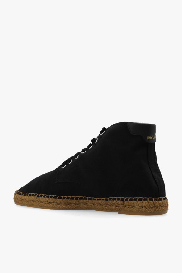 Black ‘Damon’ high-top sneakers from Saint Laurent. Crafted from cotton and trimmed with leather, this lace-up model sits on a beige rubber sole and showcases a logo patch and gold-tone logo print.