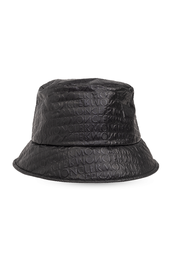 Reversible bucket hat in black from Moncler. One side showcases a logo patch and a monogram patch. The other side has a reflective logo.