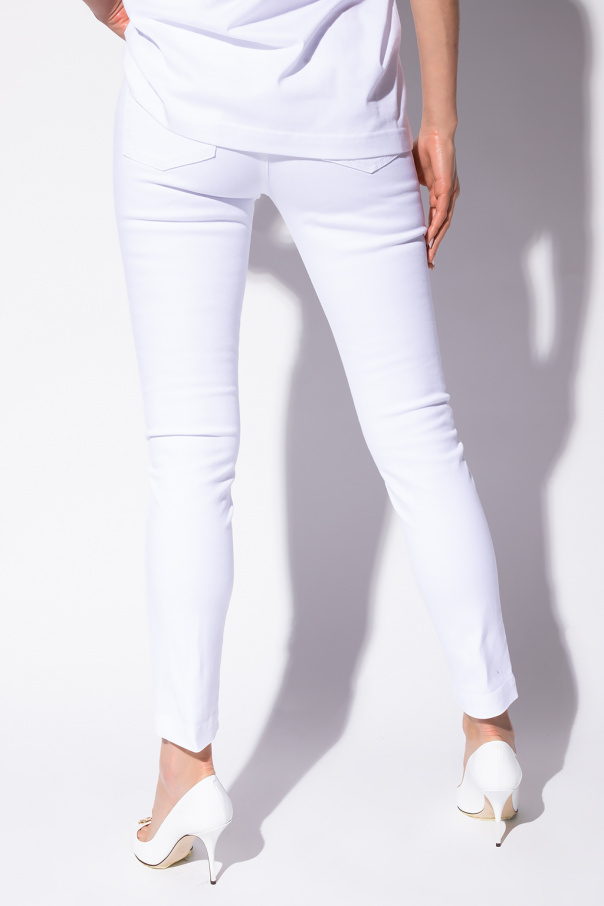 White jeans from Dolce & Gabbana. Falling down with tapered legs, this pair features a zip fly with a button and classic five pockets – a back one has a logo appliqué on it.