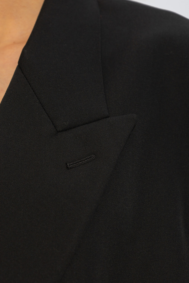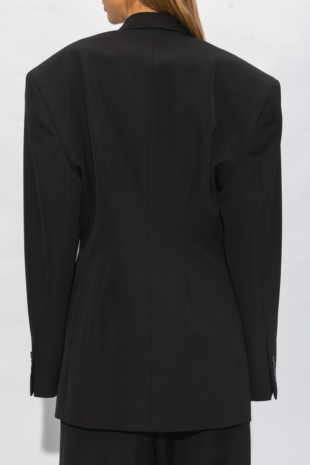 Black blazer from Balenciaga. Cut with a double-breasted silhouette, this style features front button fastenings, peak lapels, two frontal pockets, long sleeves and wide shoulders with padding.