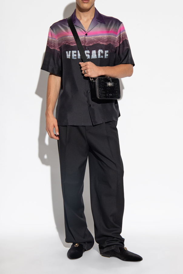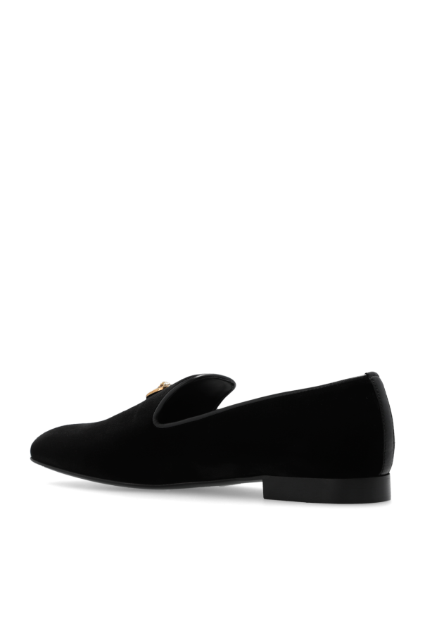 Black slippers from Versace. Rendered in velvet and trimmed with leather, this model sits on a black leather sole and showcases a gold-tone and black hardware emblem with the brand\'s signature Medusa face and Greca motif on the front.