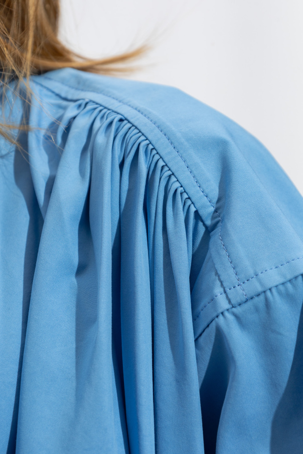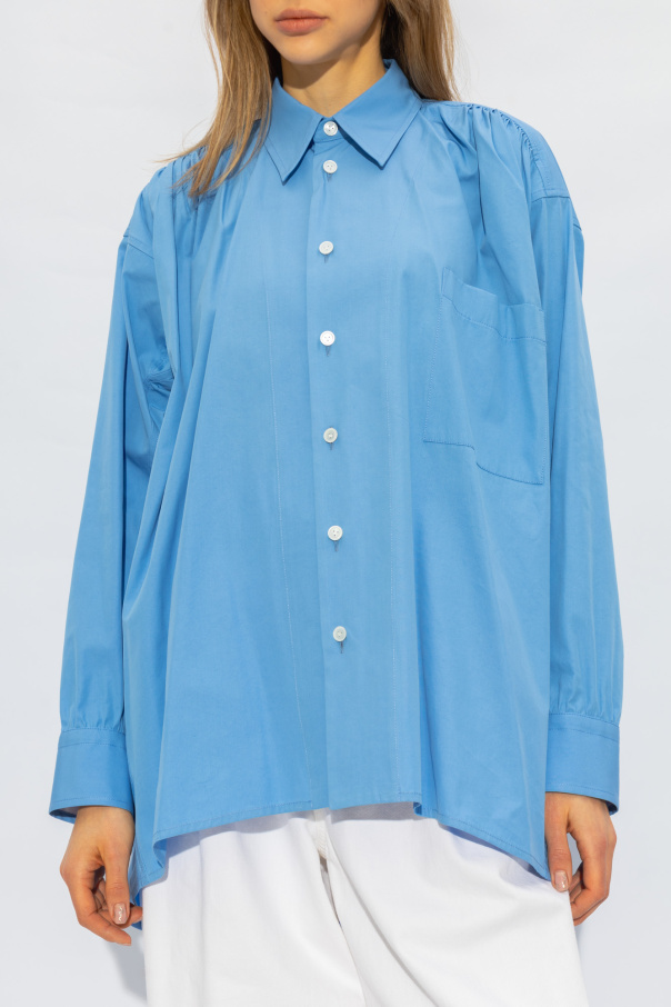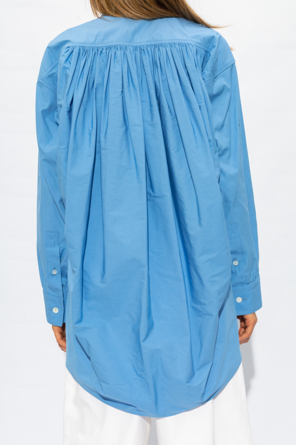 Blue loose-fitting shirt from Bottega Veneta. Made of cotton. Fastened with buttons, this design features gathers, a collar, front pocket and long sleeves with buttoned cuffs.