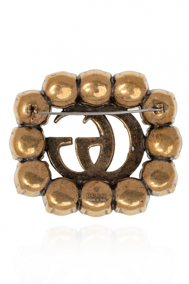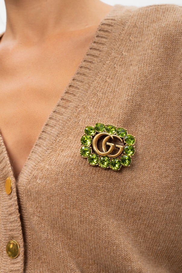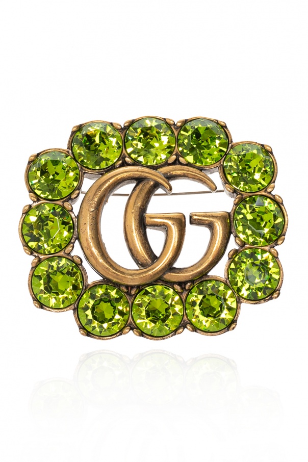 Antiqued gold-tone brooch from Gucci embellished with a Double G logo and green crystals.