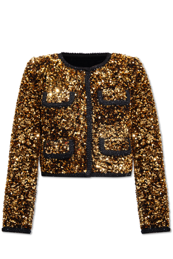 Black blazer from Self Portrait. Cut with a cropped fit and spruced up with glistening sequins, this style features a round neck, snap closures, exposed stitching details, black lurex trims, long sleeves and four decorative flaps on the front.