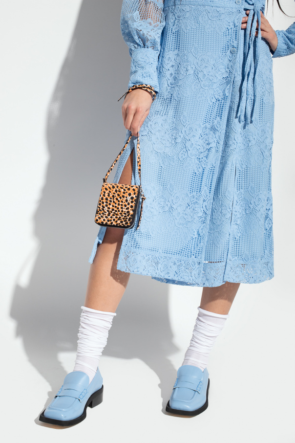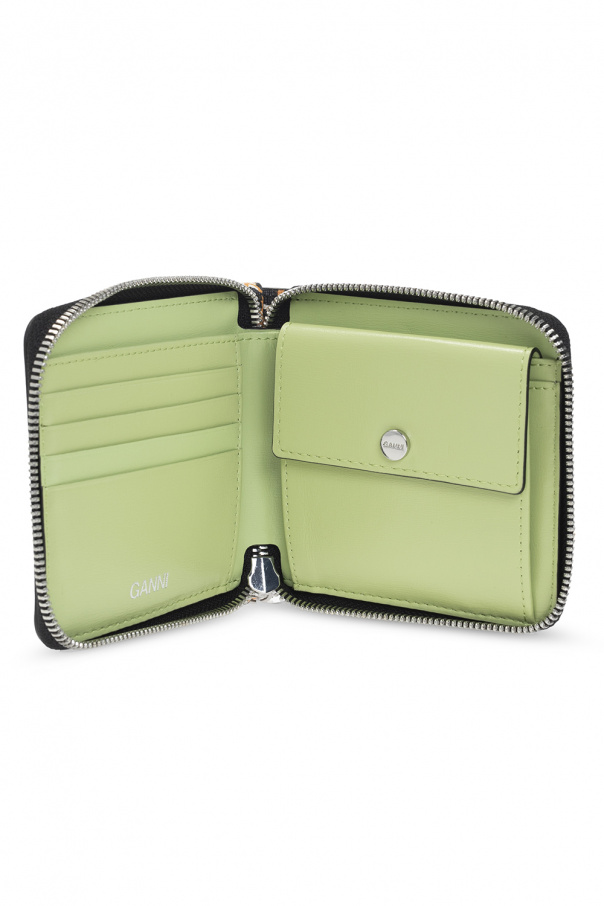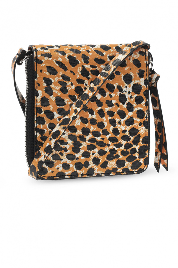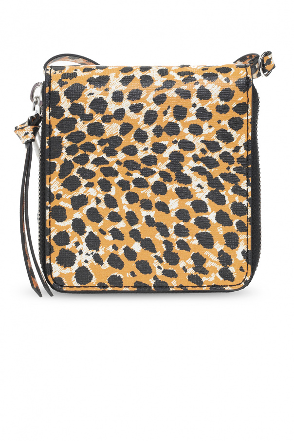 Orange, black and white bi-fold wallet on a strap from Ganni. Crafted from recycled leather and decorated with an animal pattern, this item features a zip-around fastening, a raised logo on the front, an adjustable, long shoulder strap, silver-tone metal hardware and a green-clad interior with a bill compartment, one snap-fastened coin pocket, two slip pockets and four card slots. Recycled leather has proven a lower environmental impact than conventional leather, as it reduces water usage, greenhouse gas emissions, and the amount of chemicals used.