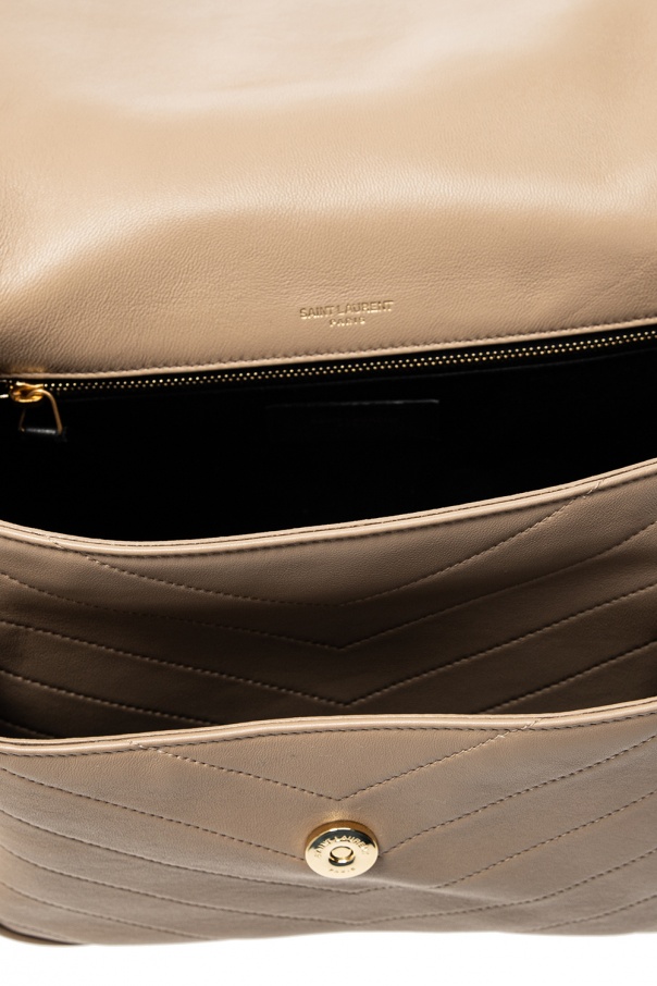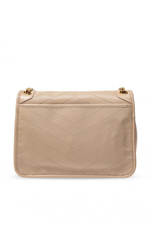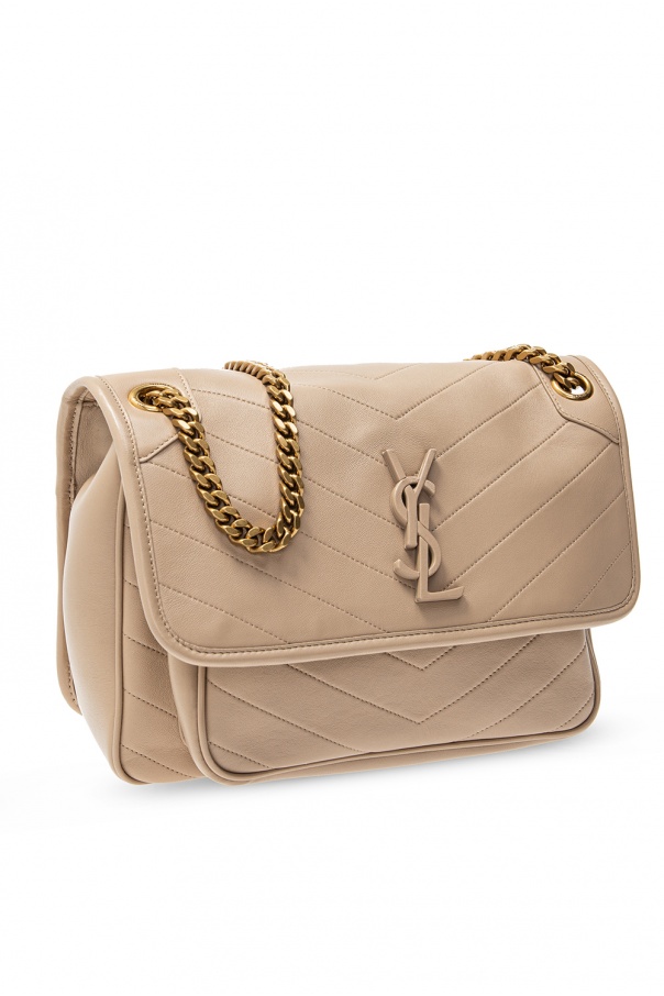 Beige ‘Niki’ shoulder bag from Saint Laurent, size medium. Crafted from textured lamb leather, this item features a snap fastening, metal logo detail, slip pocket at the back, double chain-reinforced shoulder strap, antiqued gold-tone metal hardware and a main internal compartment with one slip pocket and one zip pocket.