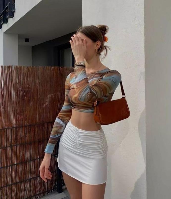 Стильный кроп топ лонгслив от Shein. Принт абстракция. Ткань микромасло. Хорошо садится по фигуре, подчеркивает женские формы. В наличии размер S, подойдет на XS-S-M, ткань хорошо стягивается и растягивается. Стан нового. .