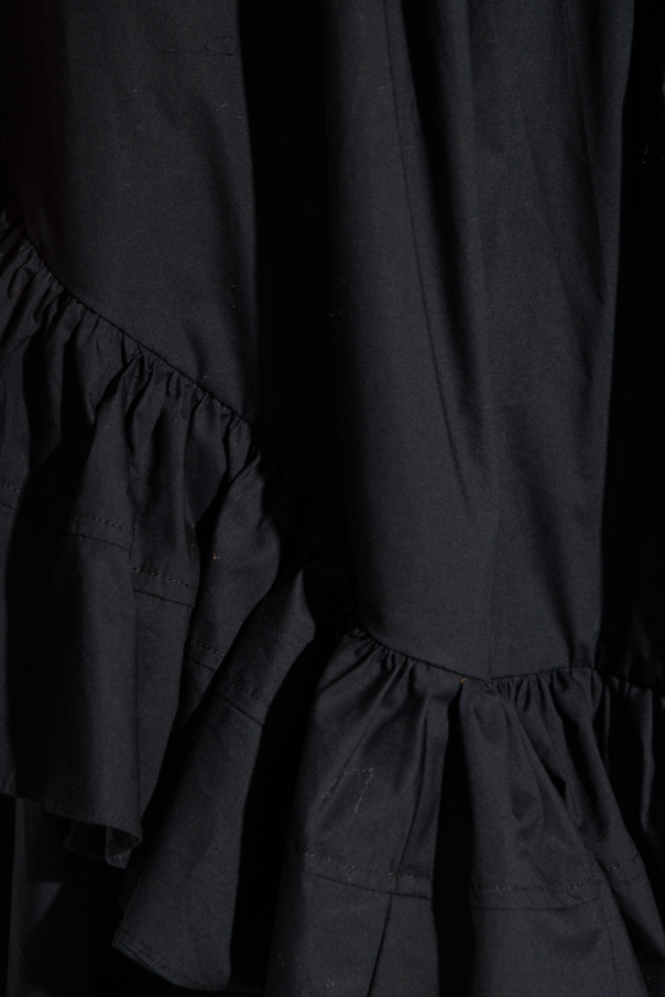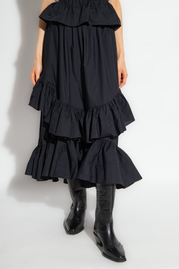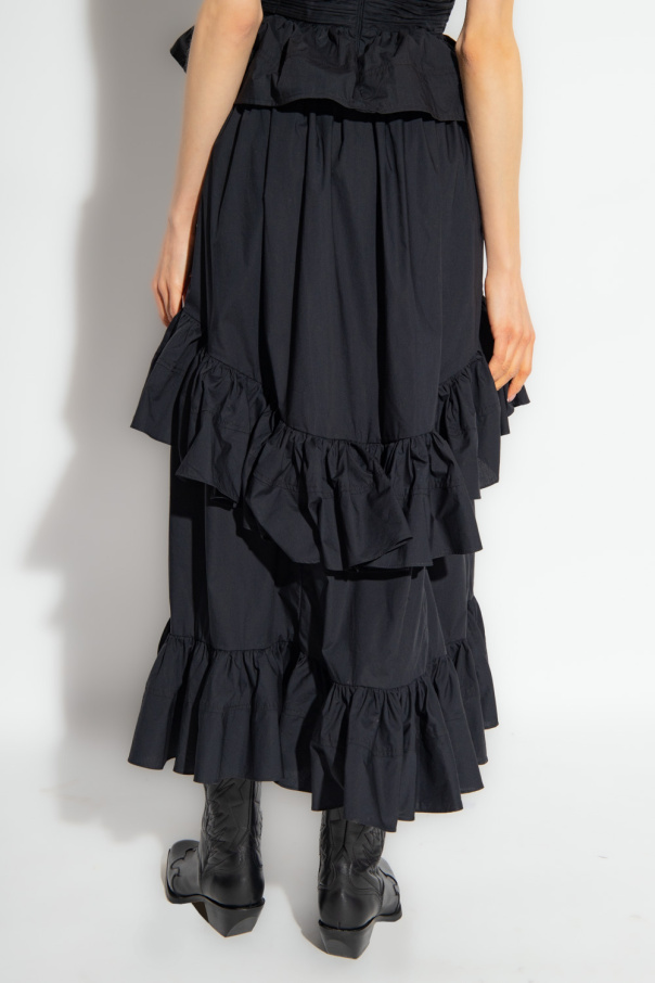 Black ‘Allegra’ skirt from Ulla Johnson. Made of cotton with a flared hem, this style features a hidden zipper and hook & eye closure at the waist, two slip pockets and asymmetrical ruffles.