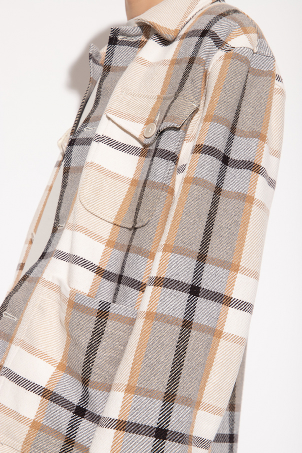 Cream, beige and grey ‘Plum’ shirt from Samsoe Samsoe. Made from a fabric blend including cotton and recycled yarns, this style features button fastenings, two slip pockets, two flapped pockets with buttons, and long sleeves with button cuffs.