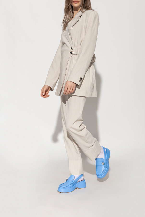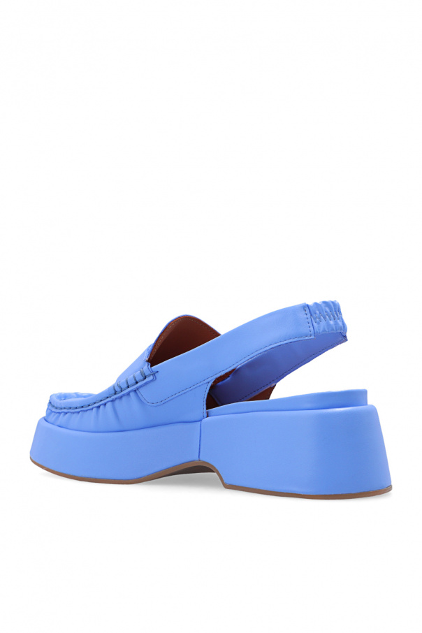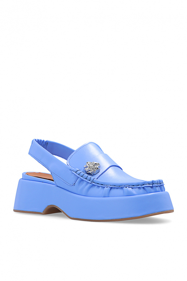 Light blue platform shoes from Ganni. Crafted from patent leather with decorative gathers, this pair features silver-tone metal appliqué, open heel and black rubber sole.