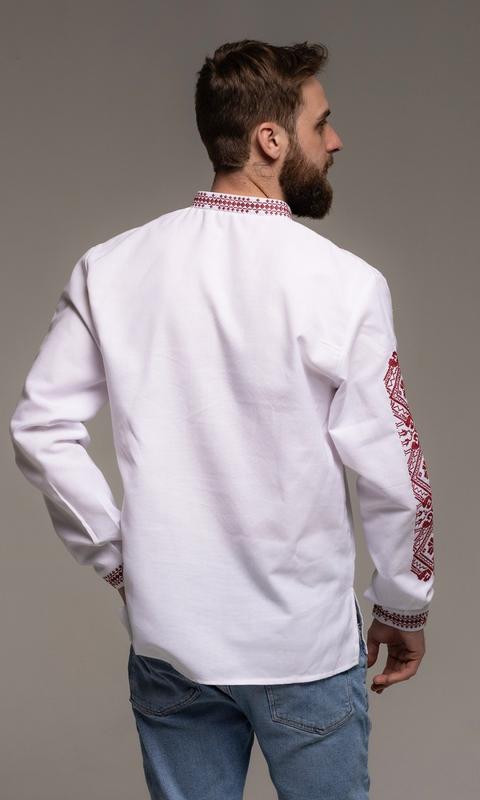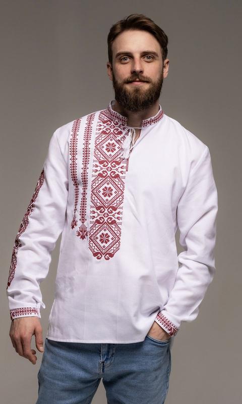 Материал – хлопок, вышивка – машинная. Узор вертикально расположен по одной стороне рубашки, что придает вышиванке особый современный стиль.