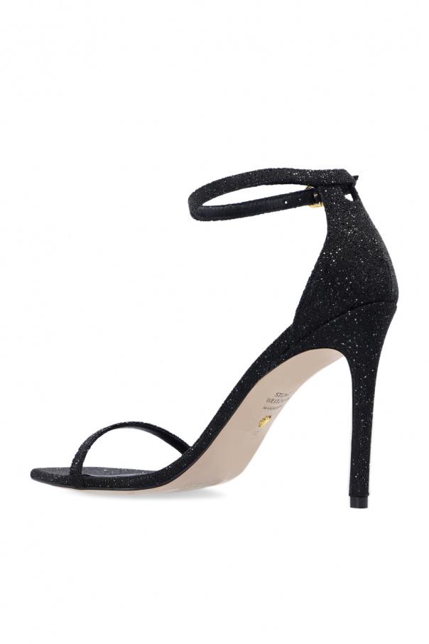 Black ‘Nudistcurve’ heeled sandals from Stuart Weitzman. Crafted from leather, this model features a buckled ankle strap, raised appliqué in silver-tone and cream leather sole.