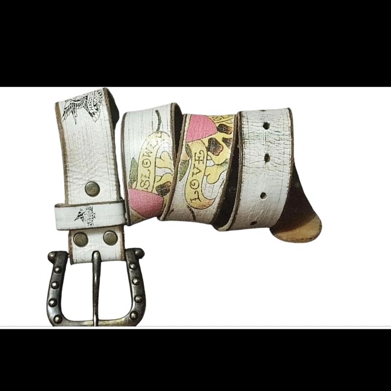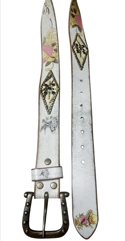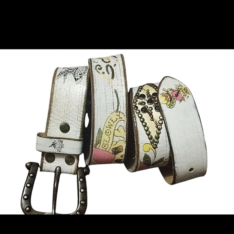 Один из самых популярных ремней от Ed Hardy by Christian Audigier из 90-х Y2 в многоцветном дизайне из состаренной кожи белого оттенка со стразами и заклепками. Аксессуар с печатной графикой татуировок, сублимированной надписью Love kills slowly (Любовь убивает медленно), подписью дизайнера и черепами для создания смелого образа. Тяжелая съемная металлическая пряжка бронзового цвета с заклепками. Ручная работа. Винтаж 90-х. Редкий. Оригинал. Размер: L. Длина - 93 см. Ширина - 3,5 см. Материалы: 100% Кожа. Пряжка - Никель.
