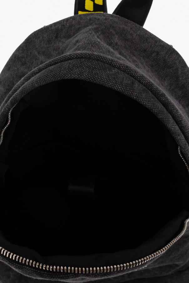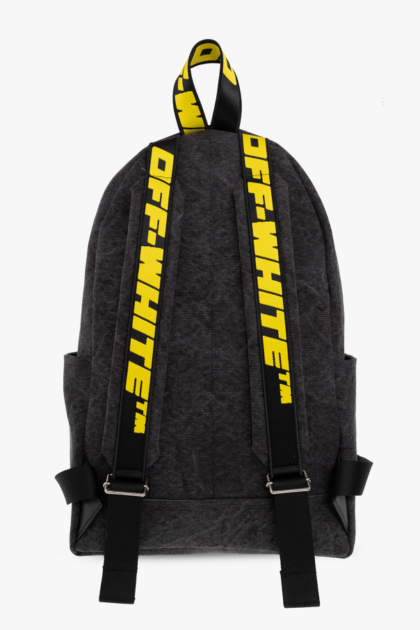 Black and grey backpack from Off-White. Crafted from cotton, this design secures with a two-way zipper and showcases two frontal zip pockets accompanied by a white graphic print, side slip pockets, a half-round handle, adjustable shoulder straps with yellow logo embroidery and one internal compartment with a snap-fastened pocket.