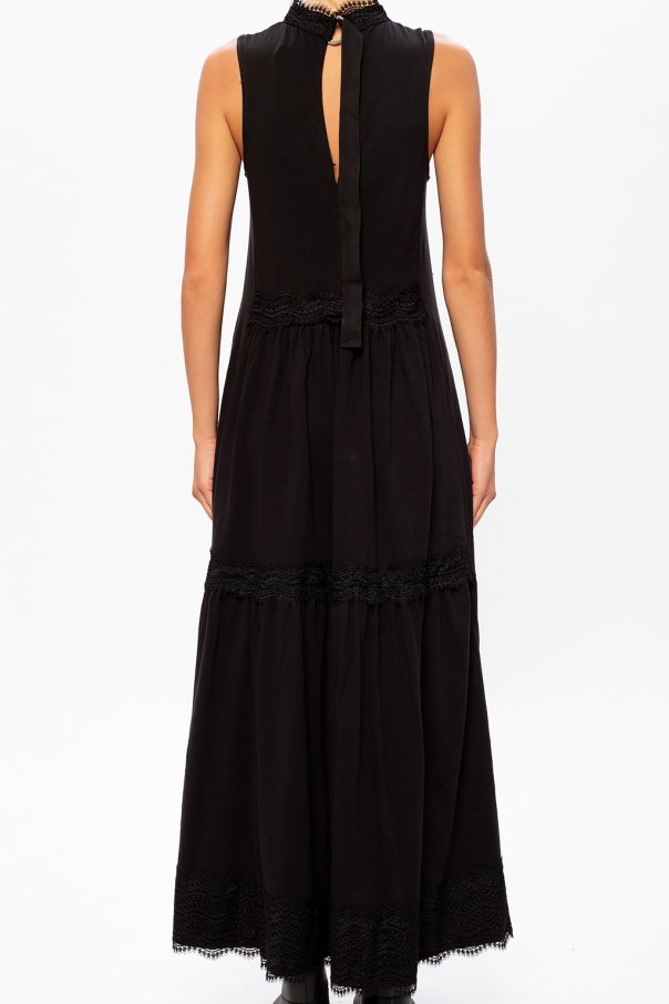 Black ‘Tier’ dress on straps from AllSaints. Crafted from cotton, this garment features a tie fastening at the back and lace trims.