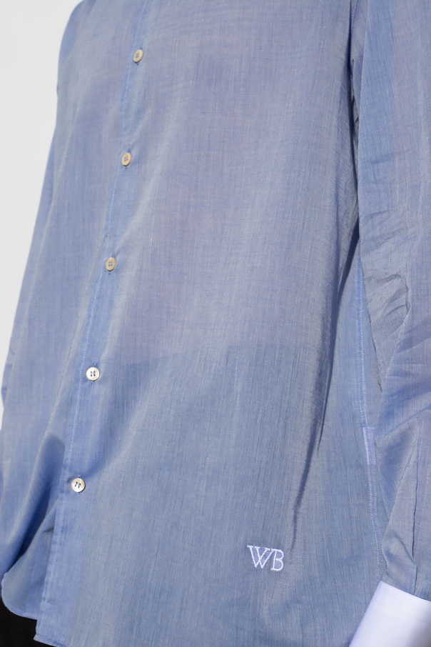Blue ‘Market’ shirt from Wales Bonner. Made of partially sheer cotton, this garment features button fastenings, logo embroidery, white collar and long sleeves with buttoned cuffs.