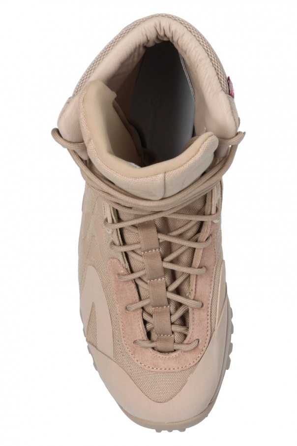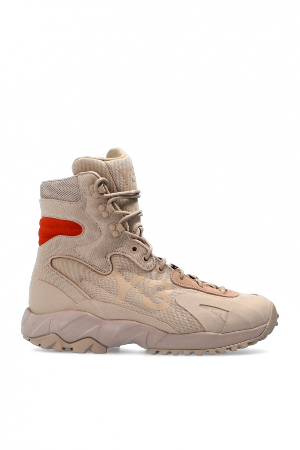Beige ‘Notoma’ hiking boots from Y-3 Yohji Yamamoto. Beige with innovative PrimaLoft® material which ensures exceptional insulating capacity in the most discerning weather conditions, this lace-up pair showcases logo appliqué and rests on EVA foam midsole and black rubber outsole with stabilizing Torsion System.