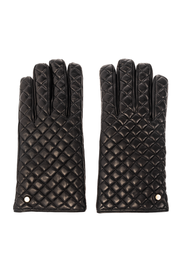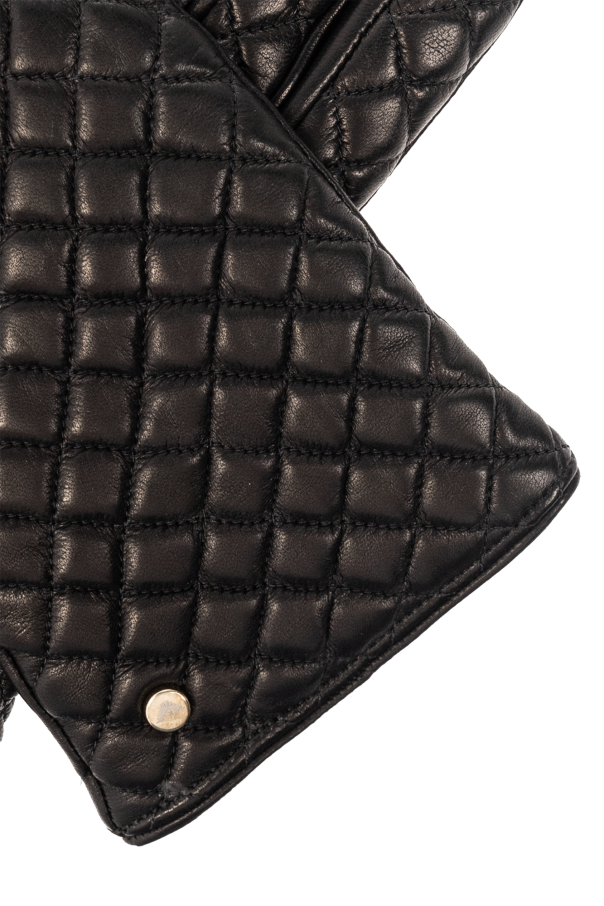 Black quilted gloves from Emporio Armani. Made of lamb leather, this pair features a round gold-tone logo appliqué and wool lining.