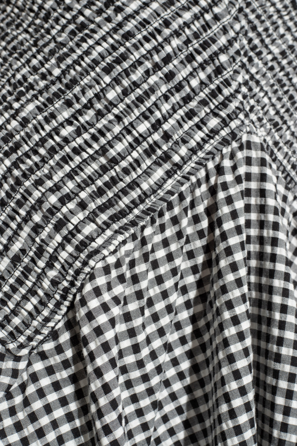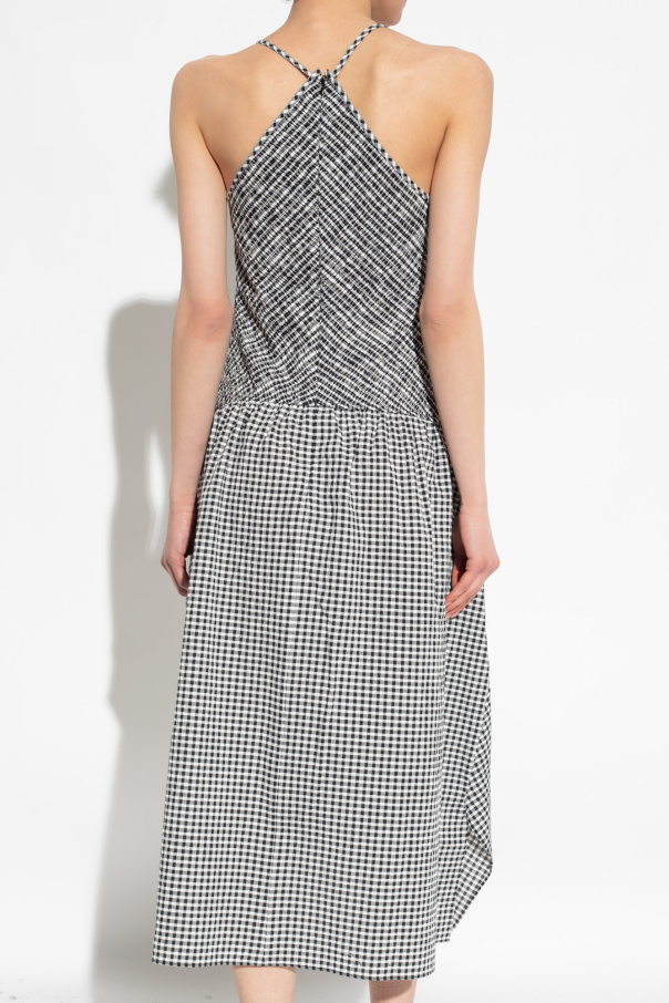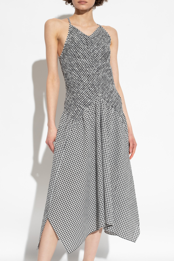White and black slip dress from Proenza Schouler White Label. Cut with a flared, sleeveless silhouette, this style secures with a back zipper and hook & eye closure and showcases a check pattern.