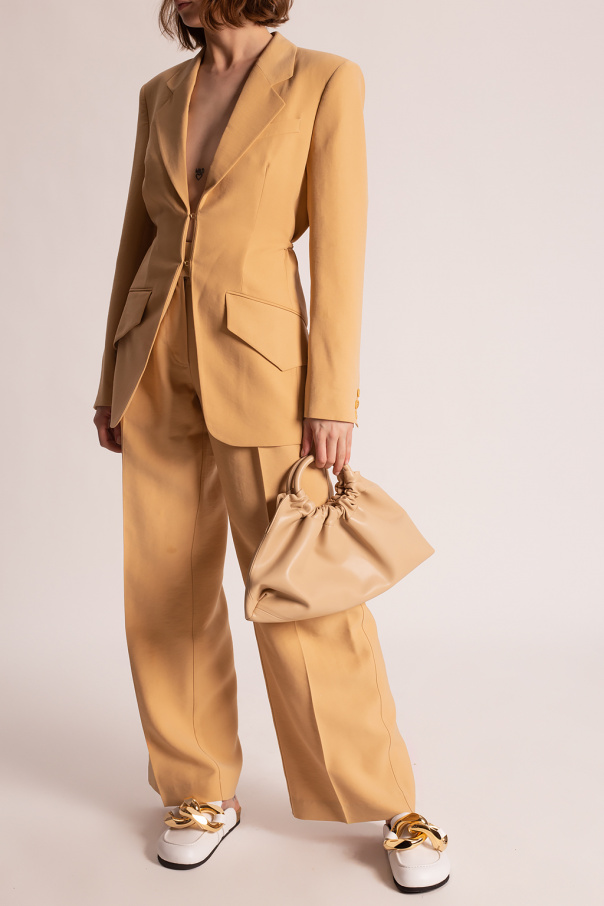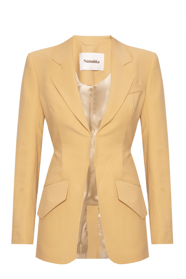 Beige blazer with notch lapels from Nanushka. Fastened with hooks, this long sleeve design features two flap pockets, one slip pocket and a single rear vent.
