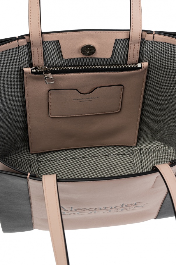 Pink and black shopper bag from Alexander McQueen. Crafted from calf leather, this item features a magnetic snap fastening, logo print, two half-round handles and one internal compartment with one zip pocket and one card slot.