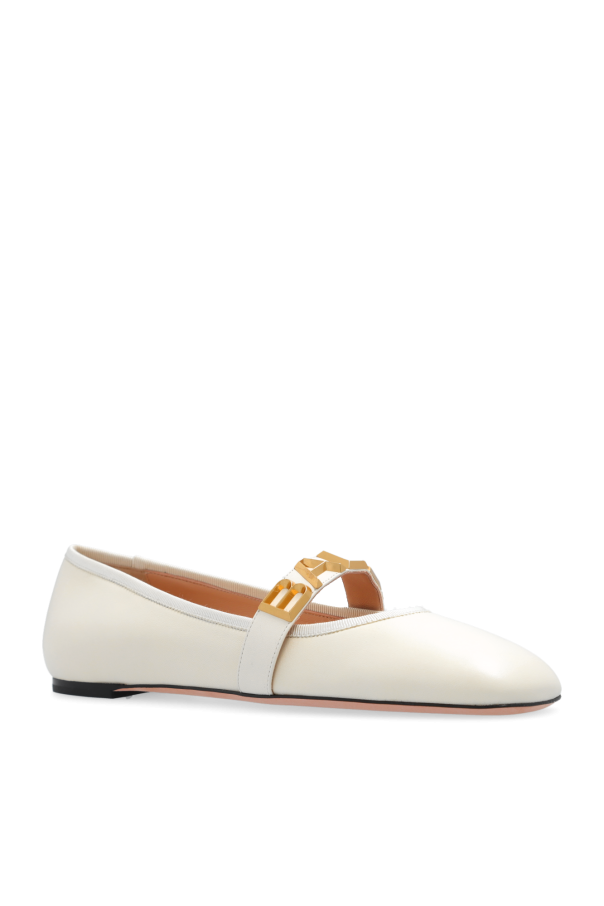 Cream ballet flats from Bally. Made of leather, this pair features an elastic strap with a logo in gold-tone, square toe and light pink leather sole.