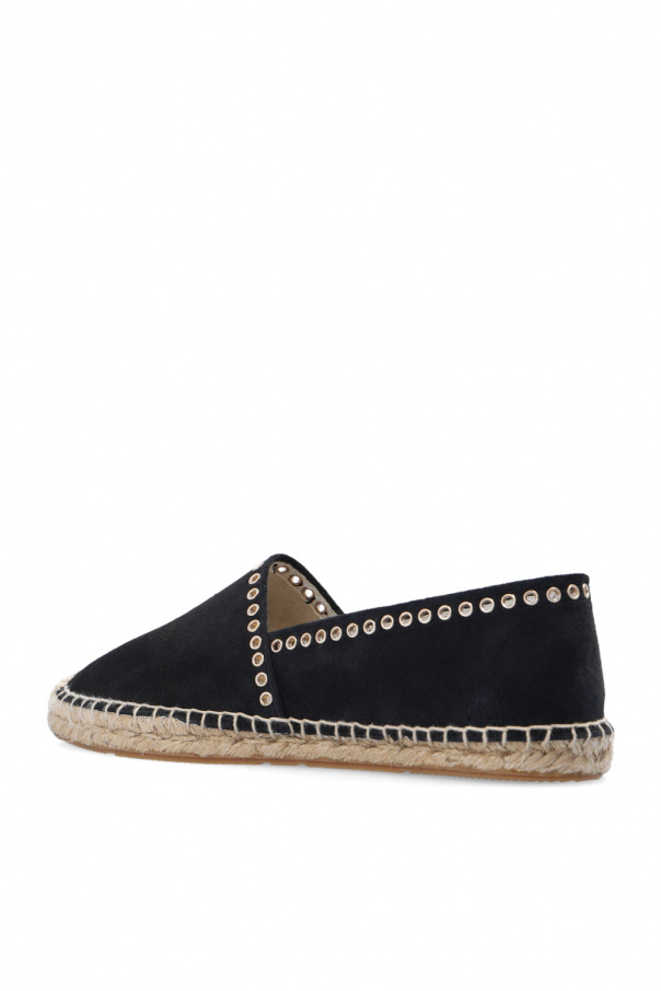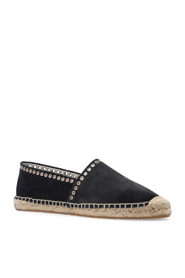 Black ‘Canae’ espadrilles from Isabel Marant. Made of calf suede, this model sits on a beige rubber sole and showcases metal applications.