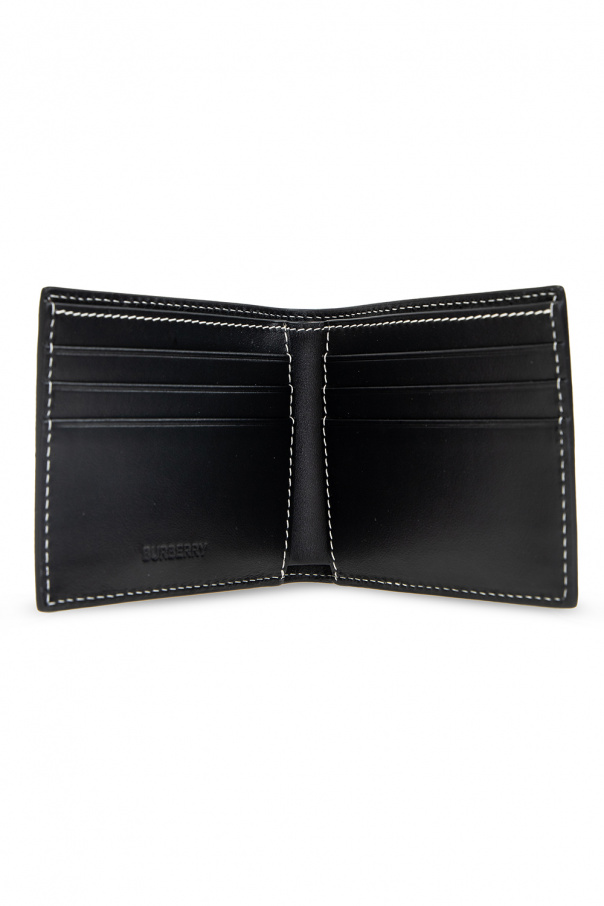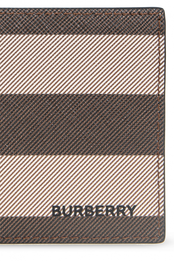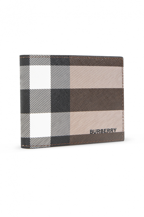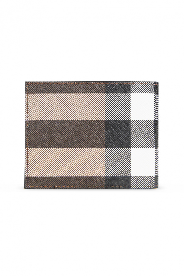 White, brown and black bifold wallet from Burberry. Decorated with the label’s signature check pattern and a logo print, this design has a bill compartment, six card slots and two slip pockets inside.