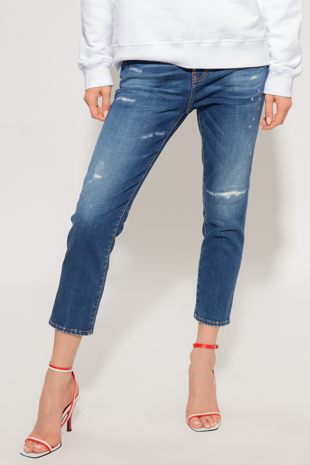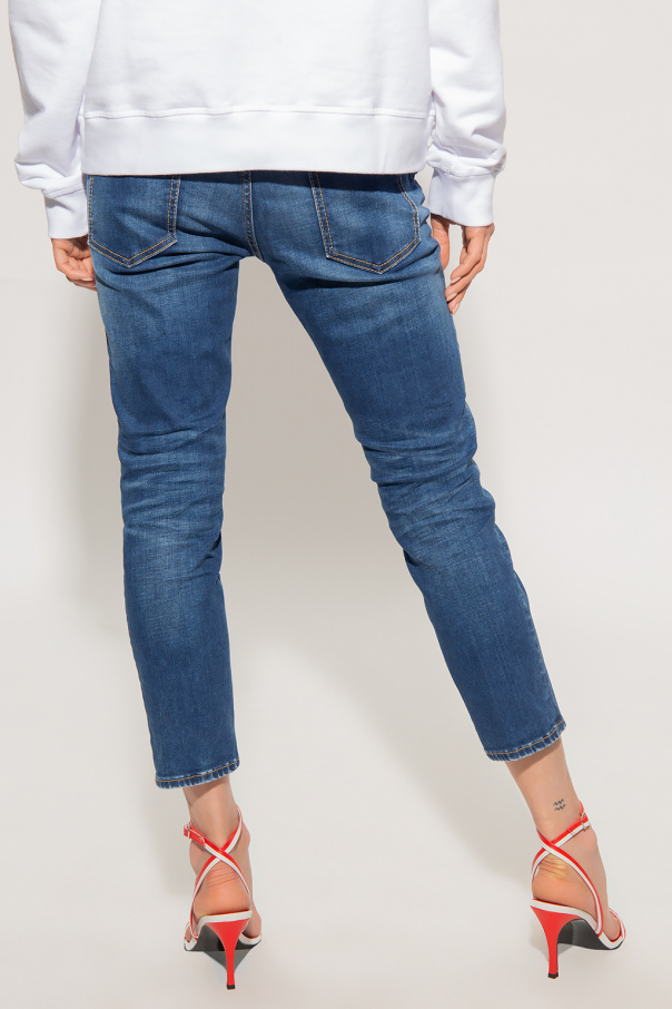 Dark blue ‘Cool Girl Cropped’ jeans from Dsquared2 x Smiley®, the ‘One Life One Planet’ capsule collections. Made of organic cotton with the GOTS certificate, this pair features button fastenings, stitching details, logo print at the back, Smiley® motif, five slip pockets and cropped, tapered legs.