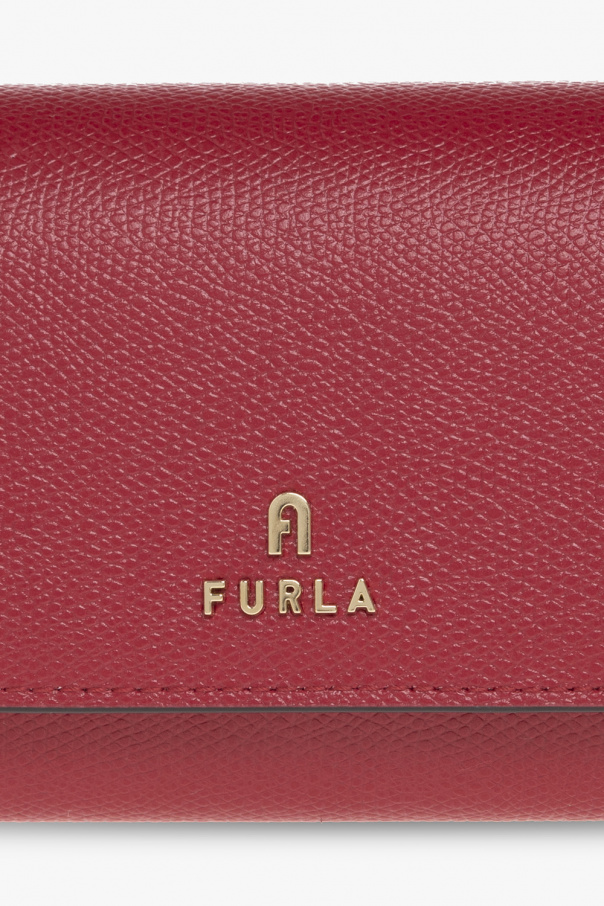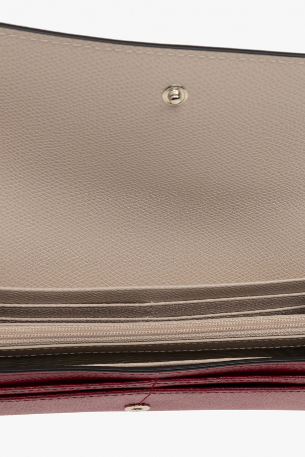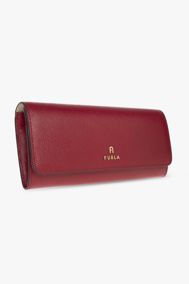 Beige and red ‘Camelia’ wallet from Furla. Made of leather, this item fastens with a snap and features a logo pattern, back pocket and gold-tone metal hardware. It has two compartments, ten card slots and one coin pocket inside.