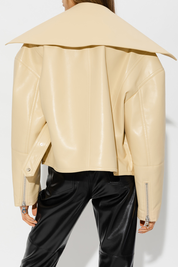 Yellow ‘Ado’ jacket from Nanushka. Made of vegan leather, this design features snap fastening, belt, notch lapels, two zip pockets and long sleeves.
