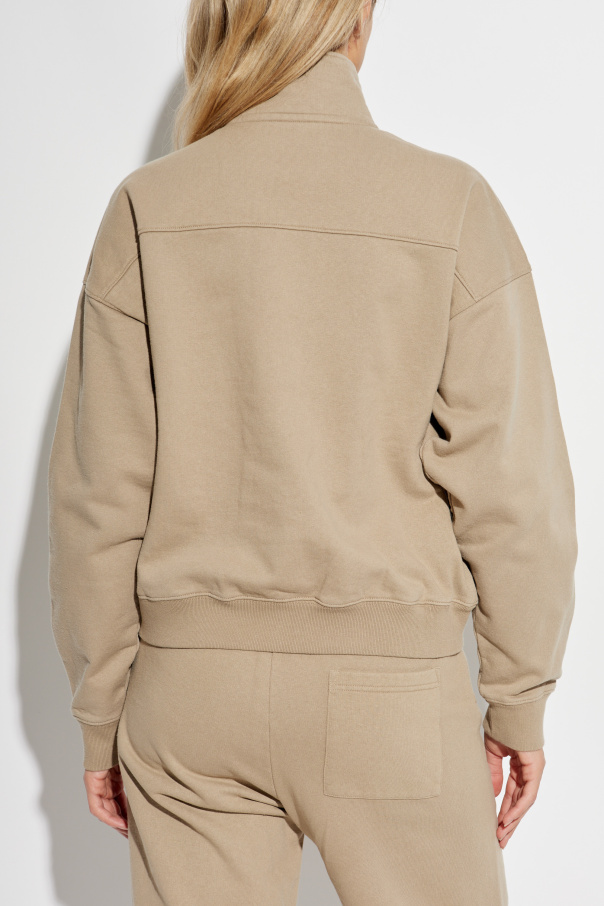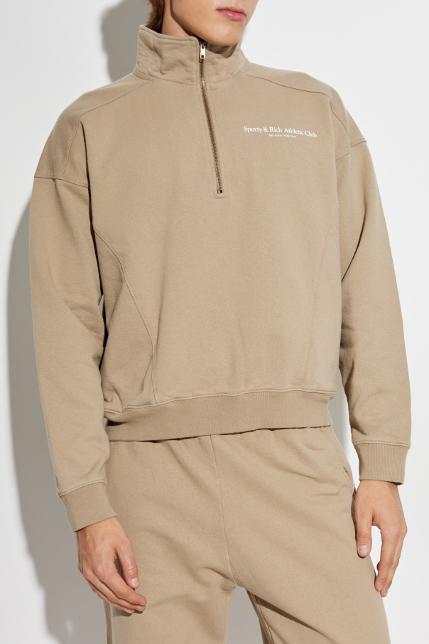 Introducing the refined Brown Crewneck Sweatshirt from the distinguished Athletic Club collection by Sporty & Rich. This elegant piece embodies the perfect blend of sophistication and athleticism, making it an indispensable addition to any wardrobe. Crafted from premium quality material, likely a luxurious cotton or a cotton blend, the sweatshirt boasts a sumptuous softness and exceptional comfort. The classic crewneck design, featuring a high collar and a zipper closure, ensures a timeless appeal. Adorned with a tasteful inscription, \"Sporty & Rich Athletic Club,\" on the left chest, complemented by the inspiring motto \"Stay Active. Drink Water\" in pristine white, this sweatshirt exudes a subtle charm. The long sleeves, finished with elastic cuffs, and the wide, elastic waistband enhance its sporty silhouette. Designed to be unisex, this sweatshirt is modeled by both men and women, demonstrating its versatile nature. The back of the sweatshirt is kept simple, with a clean seam running across the upper back, maintaining its sleek and elegant look. Why Buy This Product? Timeless design with a high collar and zipper closure Luxurious, soft material for unparalleled comfort Unisex style, suitable for all Subtle, elegant branding with an inspirational message Perfect blend of sophistication and athletic charm